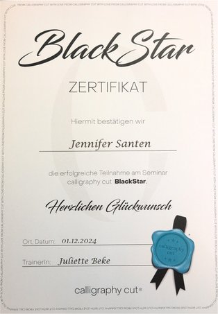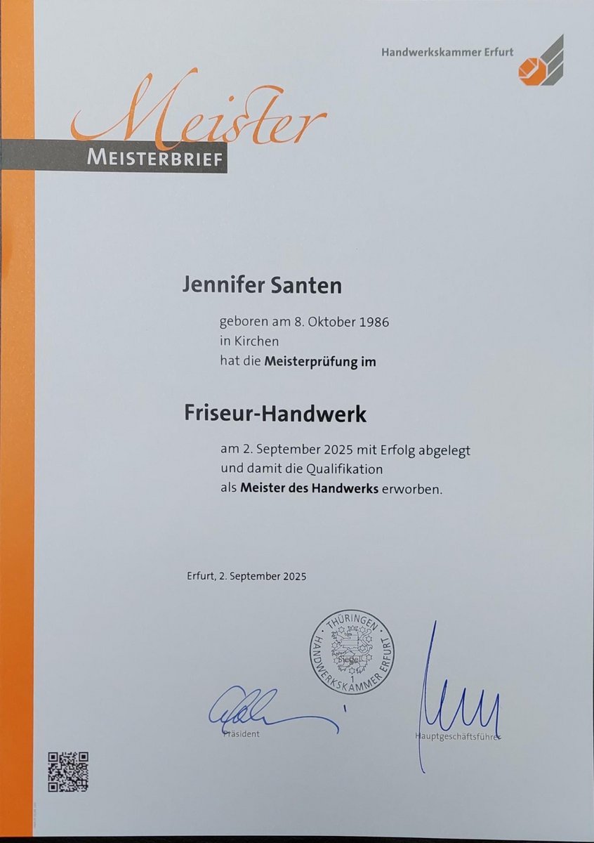 Den Meisterprüfungsteil II absolvierte ich im Mai 2025 bei der Handwerkskammer Erfurt. Am 2. September 2025 bestand ich schließlich auch den Meisterprüfungsteil I im Friseurhandwerk und darf mich seitdem stolz Friseurmeisterin nennen.