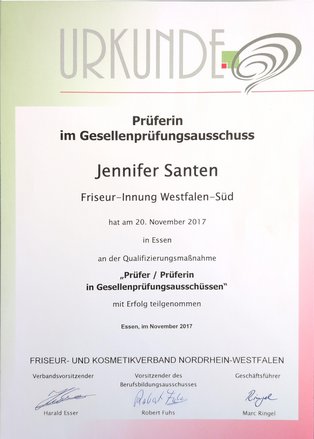 Im Mai 2023 legte ich erfolgreich die Ausbilder-Eignungsprüfung bei der Handwerkskammer Arnsberg ab. Im März 2024 folgte dort die Prüfung zur geprüften Fachfrau für kaufmännische Betriebsführung nach der Handwerksordnung. Damit verbinde ich fachliche Kompetenz mit unternehmerischem Know-how.